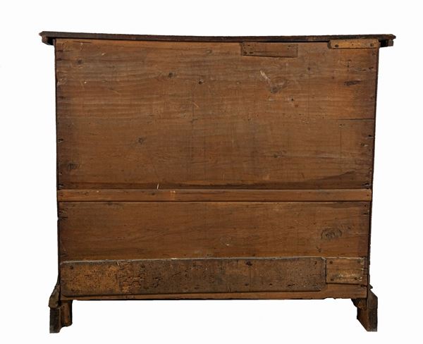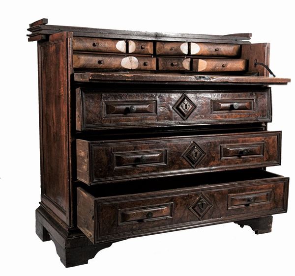 in walnut and walnut burl with ashlar on the drawers, folding top with calatoia drawer and writing desk inside and three underlying drawers. Measure cm. 117 x 51.5 x 107 h.