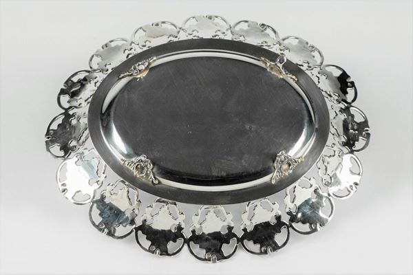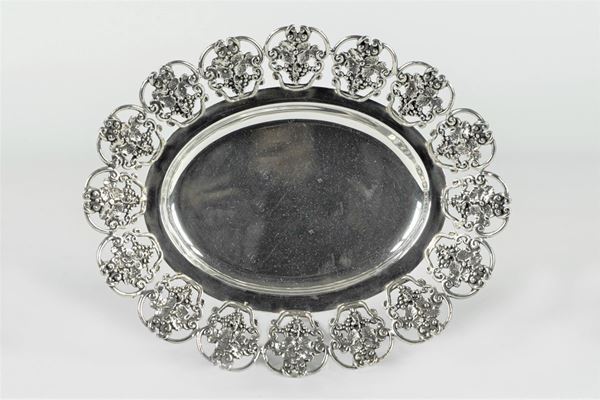 entirely chiseled and embossed with motifs of branches and bunches of grapes. Weight gr. 470. Measure cm. 23 x 19.