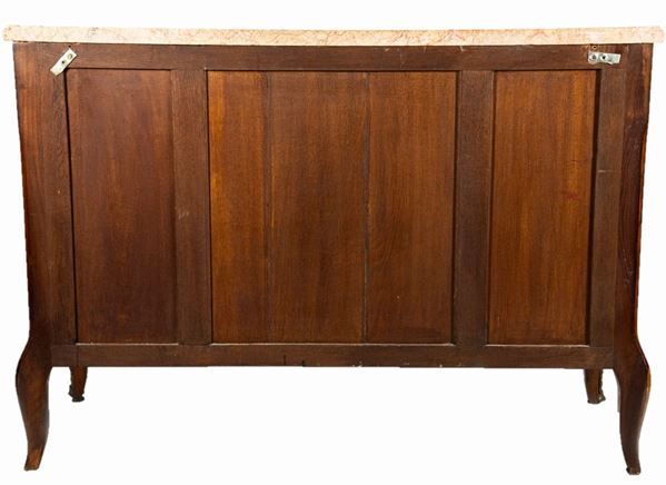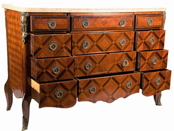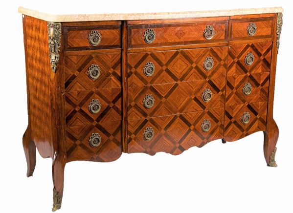 in bois de rose and mahogany with inlays with geometric motifs and neoclassical friezes in gilt bronze, four large drawers in the center and eight smaller ones on the sides, top in veined marble. Measure cm. 128 x 48 x 91.5 h.
