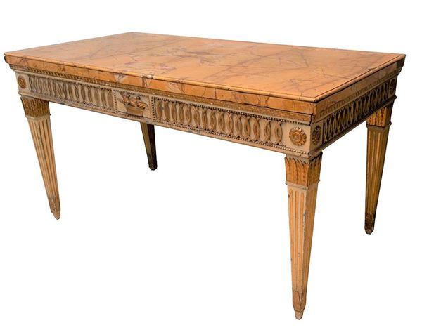 in lacquered and gilded wood with friezes carved in relief with neoclassical motifs, four legs in the shape of quivers and top in antique yellow marble. Measure cm. 178 x 88 h. 97.
