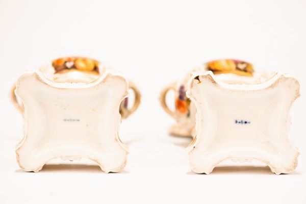 with polychrome decorations on a white background with motifs of gallant scenes, highlights in pure gold. Measure cm. 11 x 7 x 17 h. each.