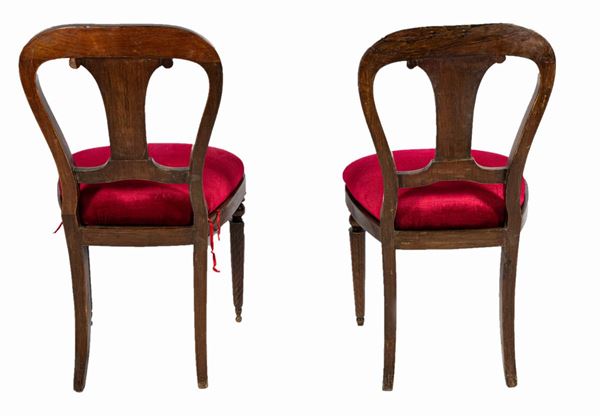 in rosewood with floral scroll inlays, cabriolet backrests and cone legs, red velvet cover. Measure cm. 43 x 39 x 85 h. each.