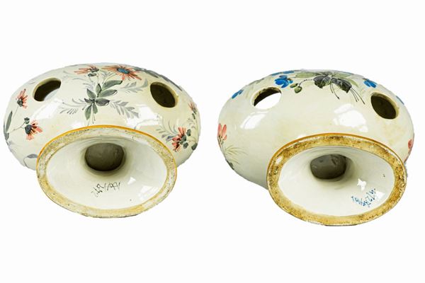 in porcelain and glazed ceramic with colorful floral motifs decorations. Measure cm. 22 x 13 x 20 h.