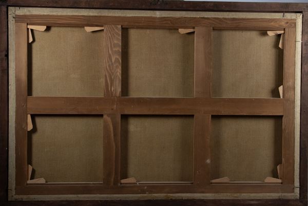 oil painting on canvas that can be attributed to the Genoese Master, a pupil of Andrea de Ferrari and perhaps also of Giulio Benso, from whom he was influenced by the tendency of narration and Naturalism. He was also influenced by the School of the Emilian Masters. Frame in gilded wood. Measure cm. 93 x 144.