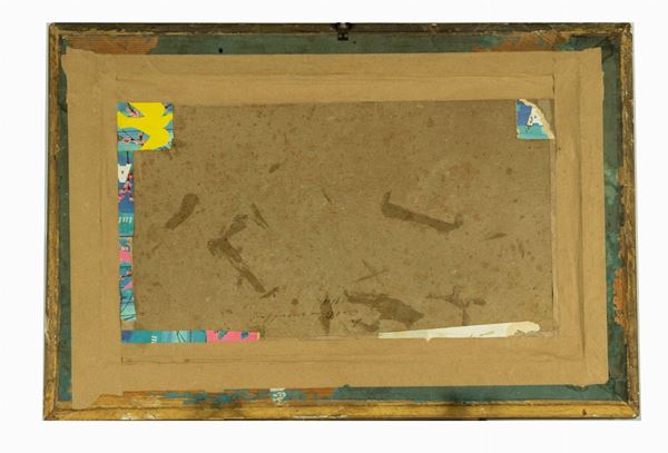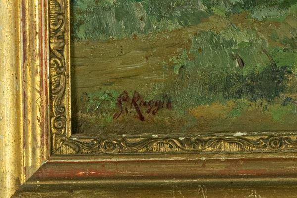 oil painting on cardboard by Raggio who, once settled in Rome, began to paint with frayed brushstrokes, views of the Roman countryside and moments of life of herds and herdsmen. On the back inscription in pen: Castelgandolfo 1914. Frame in gilded wood. Measure cm. 22 x 37.