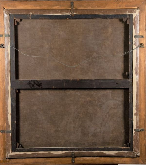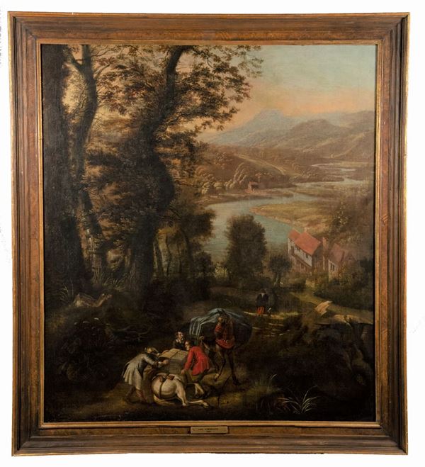 oil painting on canvas by the Flemish artist who specialized in landscapes and was influenced by the Dutch Master Dujardin, however, showing a very personal style with a palette tending to cold tones but lit by the large colored backgrounds in the garments of the characters. Frame in gilded and lacquered wood. Measure cm. 110 x 97.