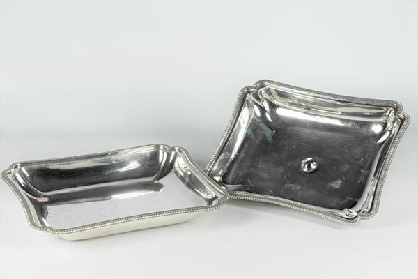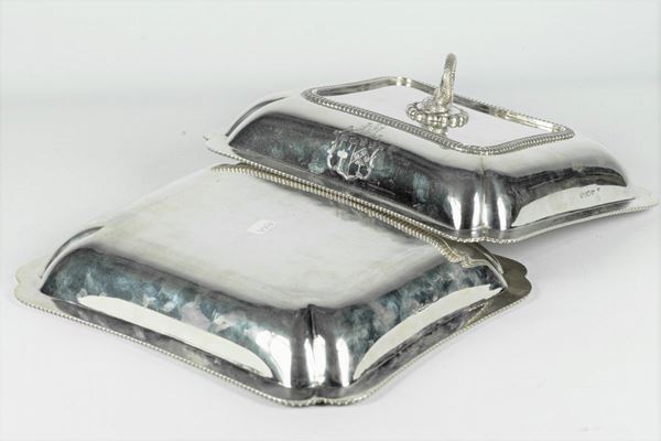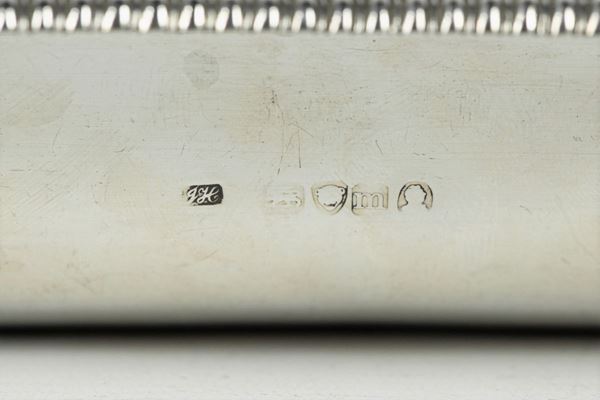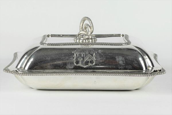 Silversmith Jonathan Hayne, rectangular shaped with ribbed edges and pommel in the shape of a snake. Weight gr. 1770. Measure cm. 29 x 24 x 11 h.