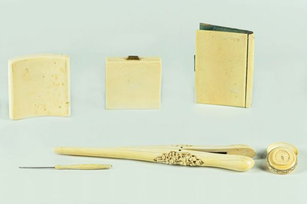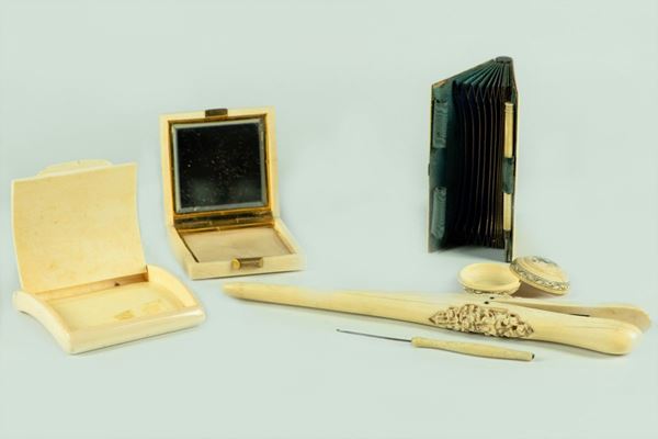 of: 1 cigarette case, 1 coin purse, 1 powder box, 1 mustache, 1 round box and 1 lace tie. Tot 6 pcs. Maximum length cm. 23.