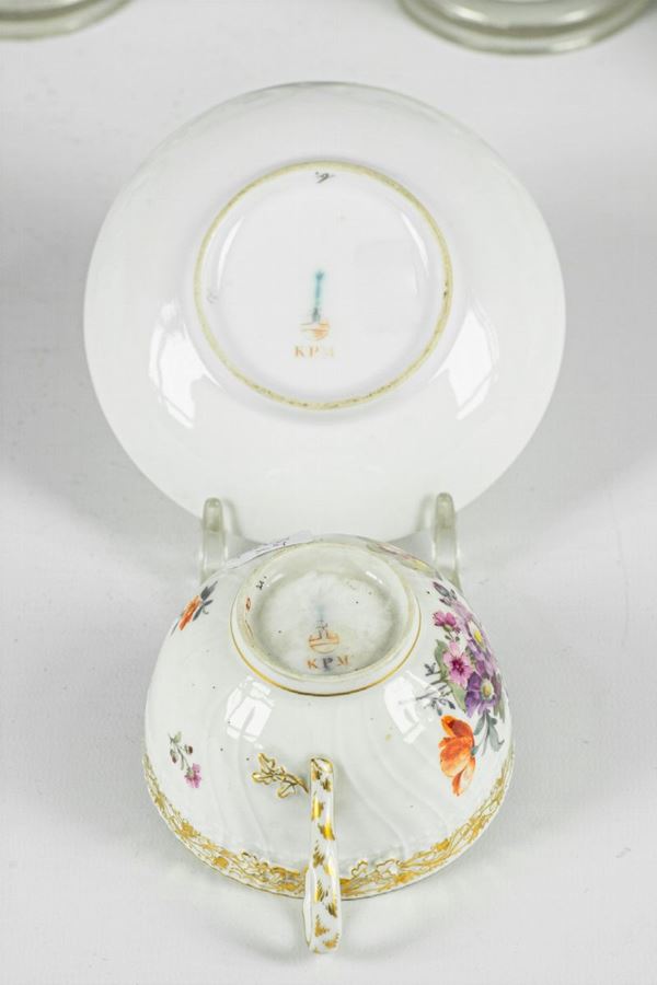 of nine cups with saucers, one of which is smaller, with multicolored decorations with motifs of bunches of flowers and pure gold highlights.