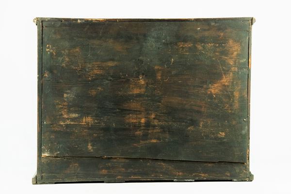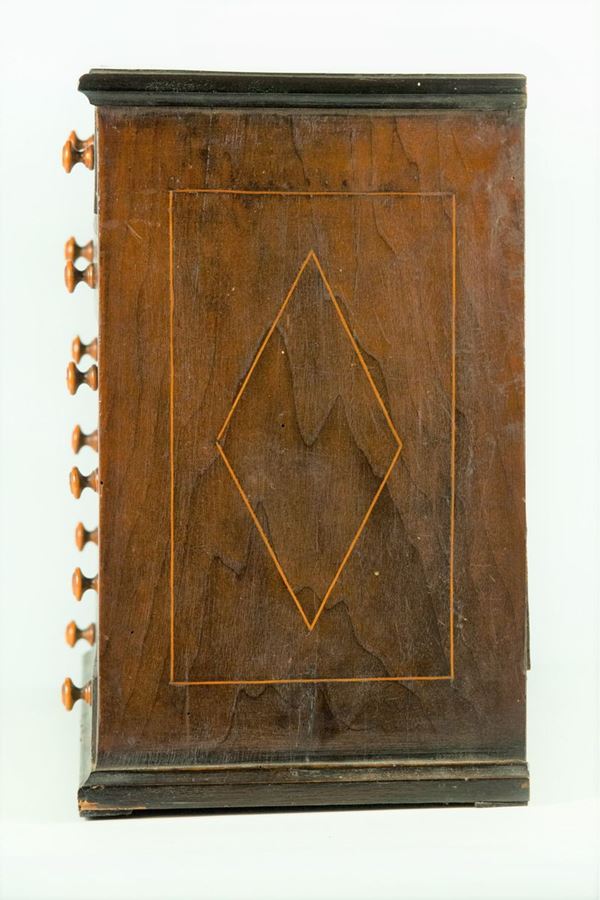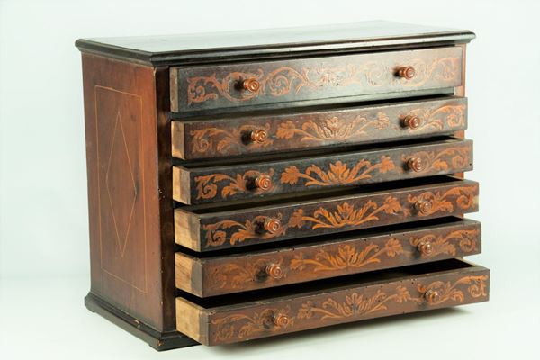 in walnut with inlays with threads and floral intertwining, six pulls and turned knobs. Slight defects and shortcomings. Measure cm. 53 x 24 x 40 h.