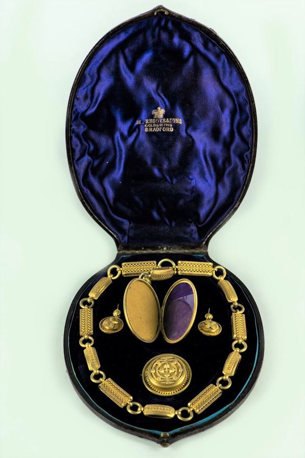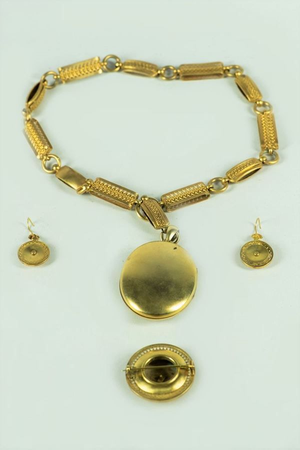 composed of: necklace with oval medallion photo frame, brooch and pair of earrings in antique leather case of the time. & nbsp; & nbsp;