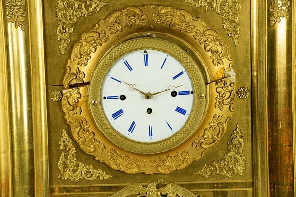 with Empire motif carvings and white enamel dial with Roman numerals. Not working, to be overhauled. Measure cm. 43 x 14 x 53.5 h.