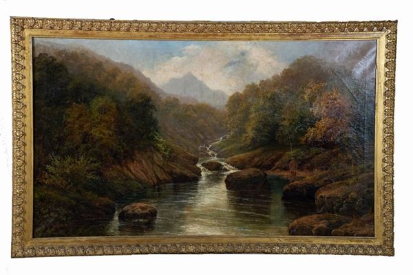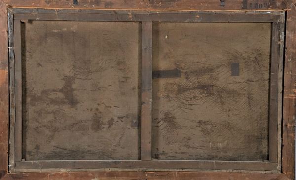 antique oil painting on canvas in gilded and carved frame. Measure cm. 76 x 130.