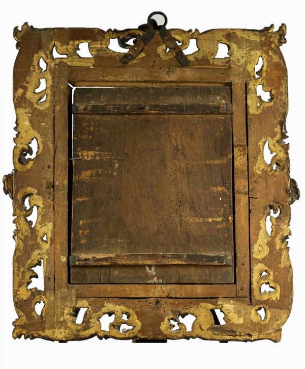 oil painting on wood in a gilded wood frame, patinated and carved with floral scroll motifs. Measure cm. 38 x 30.