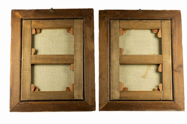 pair of oil paintings on canvas in gilt and green lacquered frames. Measure cm. 46 x 34 each.