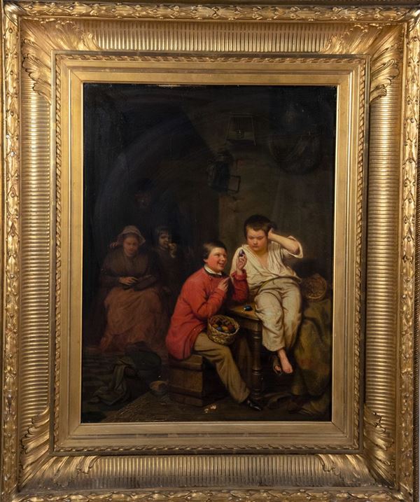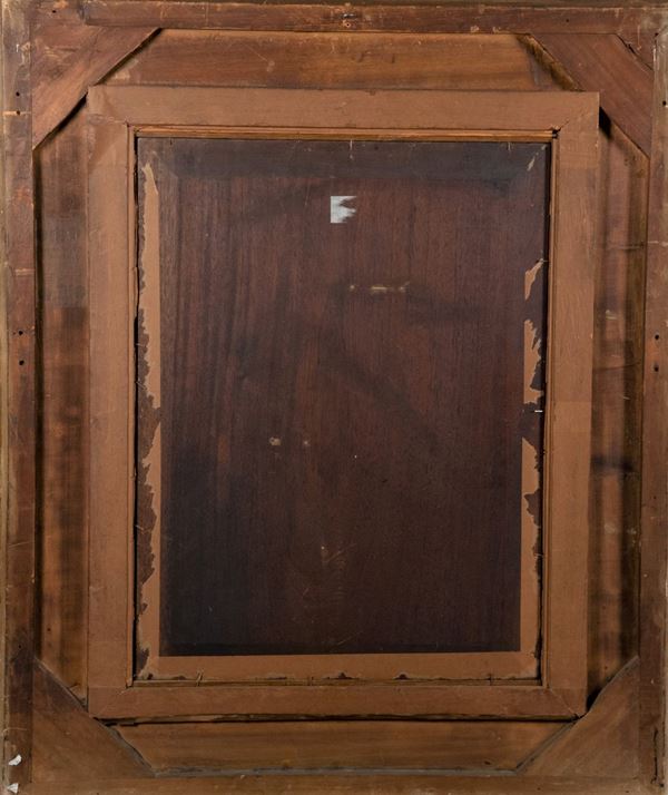 oil painting on wood in gilded and carved frame. Measure cm. 65 x 50.