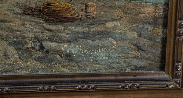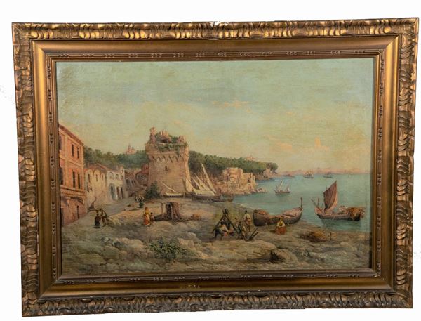 "Marina with a view of the small port and boats with fishermen". Signed.