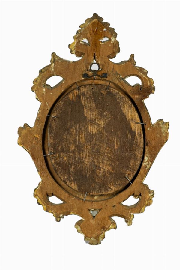 small oval-shaped oil painting in mecca gilded wood frame. Measure cm. 14 x 12.