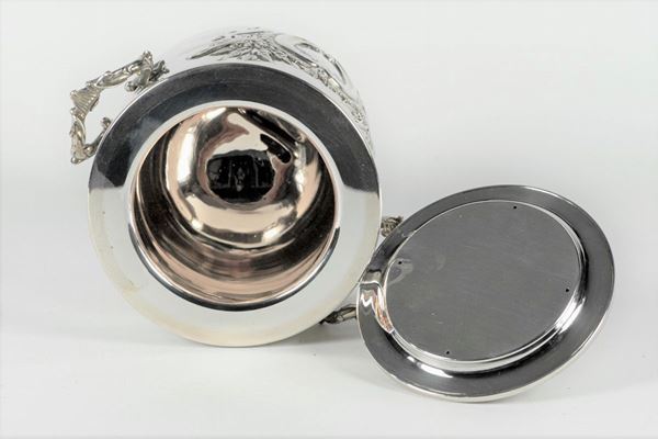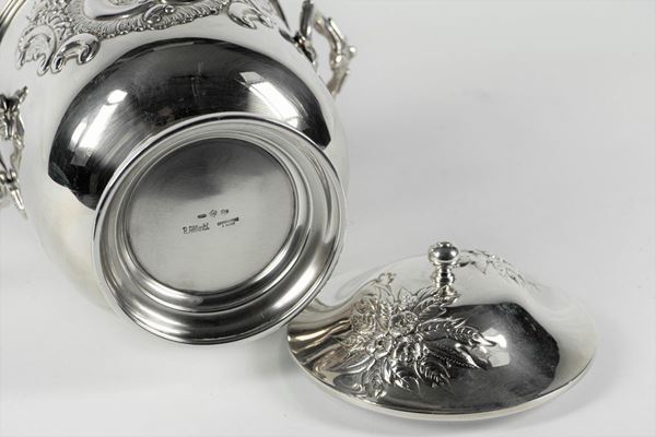 chiseled and embossed with floral volutes, chiseled handles and lid, inside thermal container. Height cm. 16.