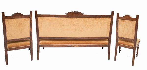 with highlighted and gilded carvings, composed of: sofa, two armchairs and four chairs. Tot. 7 pcs. Measurements: sofa cm. 161 x 60 x 110 h. - & nbsp; armchairs cm. 57 x 60 x 110 h. each - & nbsp; chairs & nbsp; cm. 45 x 47 x 108 h. each.