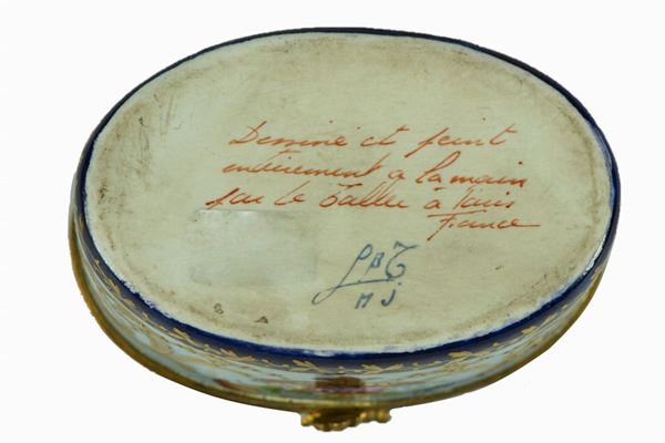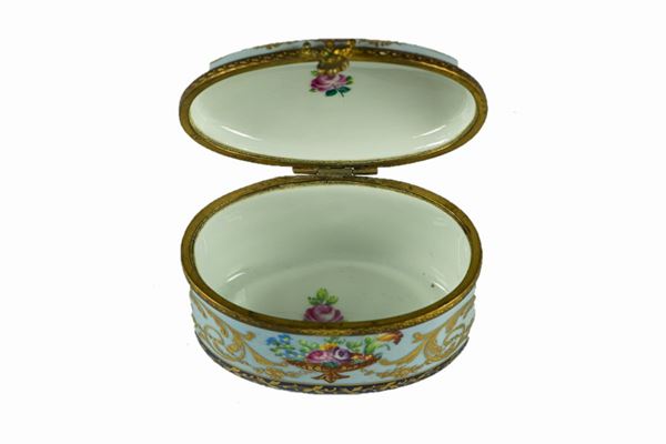 with polychrome floral motifs decorations and pure gold scrolls on a light blue background. Measure cm. 9 x 6.5 x 5 h.