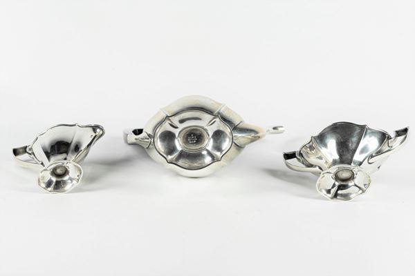 with traces of vermeil inside, consisting of: coffee maker, milk jug and sugar bowl. Tot. 3 pcs. Weight gr. 550. Maximum height cm. 23.