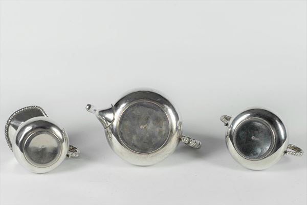 with embossed edges and handles with a torchon motif, consisting of: teapot, milk jug and sugar bowl. Tot. 3 pcs. Weight gr. 940. Maximum height cm. 14.