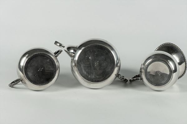 with chiseled edges and handles, consisting of: teapot, milk jug and sugar bowl. Tot. 3 pcs. Weight gr. 1100. Maximum size cm. 21 x 12.5 x 16 h.