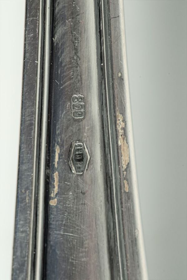 with chiseled handles consisting of: 12 large spoons, 12 large forks, 12 large knives, 12 small forks, 12 small knives, 12 dessert forks, 12 tea spoons, 12 coffee spoons, 1 large ladle and 2 stirrers. Tot. 99 pcs. Weight gr. 3200. & nbsp;