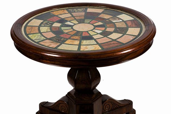 in a radial pattern of inlays of various precious marbles, round shape and faceted column base resting on three curved legs ending in lion's feet. Diameter cm. 79.5 x 71 h.