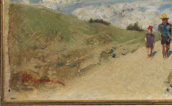 small oil painting on cardboard made with a bright stroke. Signorini in 1852 enrolled at the Academy of Fine Arts in Florence and already in 1856 he would have left the Academy, thus freeing himself from academic schematisms and arriving at the painting "En plein air", which he practiced together with his friends O. Borrani and V. Cabianca. In 1855 he began to participate in the meetings of the Caffè Michelangiolo, where the painters who participated there experimented the novelties of the "stain". After a trip to Paris in 1861, returning to Italy, he stayed for a short time in Castiglioncello together with other Macchiaioli and then founded with the Lega and Borrani the so-called "School of Piagentina", named after the Florentine town where they used to paint. outdoors, taking inspiration from nature and its poetic seasonal change. In recent years, Signorini went assiduously to Paris, where he came into contact with Impressionist painting and its major exponents, such as Degas, Manet and Monet, undergoing a very particular influence. Signorini was among the most significant personalities of the "Macchiaioli Group", of which he was also a theorist. His paintings are always animated by a sharp impressionism and realism with urban and landscape subjects. Frame in gilded and carved wood. Measure cm. 18 x 27.