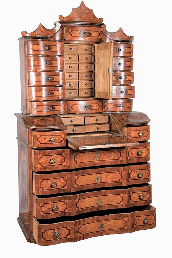 in walnut, tuja burl, olive burl and maple wood, entirely inlaid with geometric motifs and intertwined scrolls, a work of high cabinet-making. The upper part with a series of drawers and door in the center with secrets inside, the lower part with a central calatoia forming a desk, two drawers on the sides and four large drawers below. The initials F. V. are branded on the three cymas and in the center chalice with host. Probably the piece of furniture was ordered and made for a Cardinal. Measure cm. 122 x 66 x 217 h.