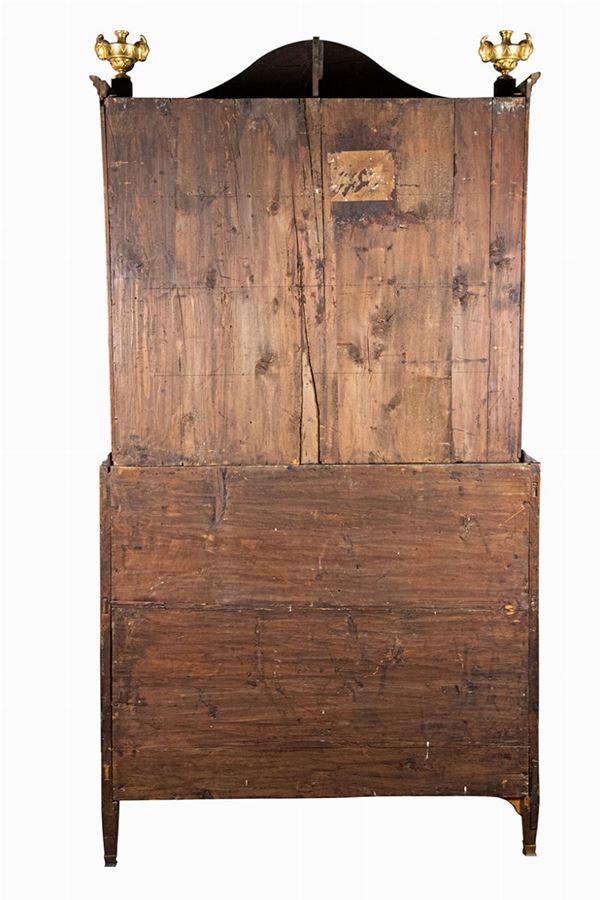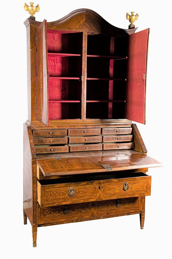 in walnut, bois de rose and satin wood inlaid with floral scroll motifs, neoclassical garlands, rosettes and amphorae with flowers. The upper part has two doors, the lower part with a calatoia forming a writing desk with nine small drawers inside, three drawers below and legs in the shape of an inverted pyramid. Measure cm. 123 x 58 x 231 h.
