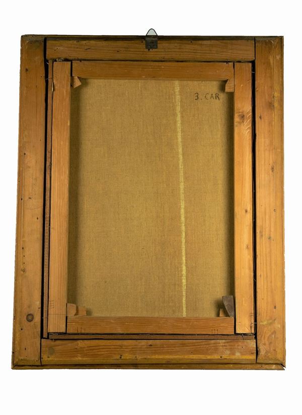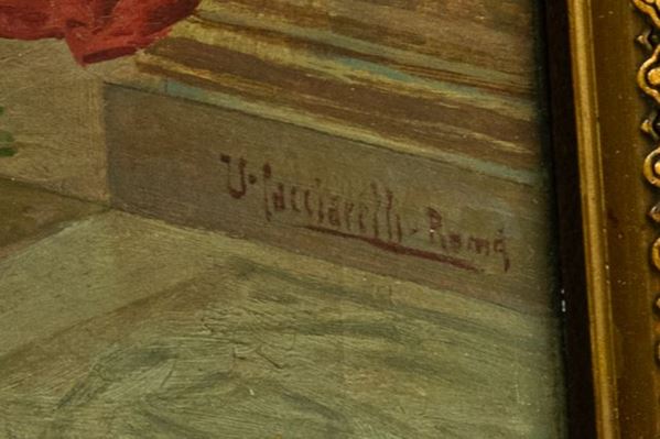 oil painting on canvas by the Roman artist who was part of the "Society of Roman Watercolors" and had great success for oil paintings, but above all for the watercolors that he treated with spontaneity and pleasantness, portraying both the typical scenes of Rome and of the Roman Campagna and ecclesiastical subjects. Frame in gilded and carved wood. Measure cm. 55 x 40.