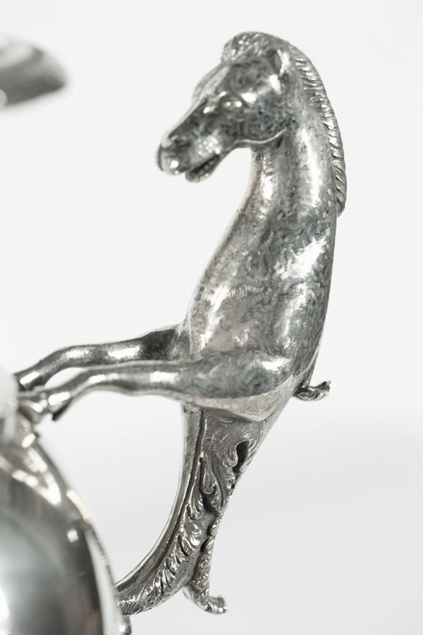Silversmith Vincenzo Belli, chiseled and embossed with handles in the shape of fantastic sea horses. Height cm. 33.