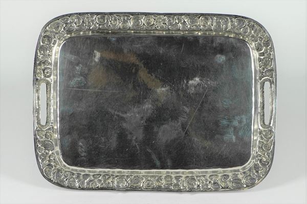 rectangular in shape with entirely chiseled and embossed edge with floral garland motifs, fruits and shells. Weight gr. 480. Measure cm. 31 x 23.