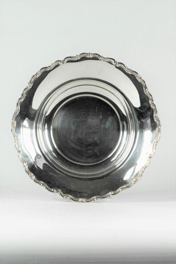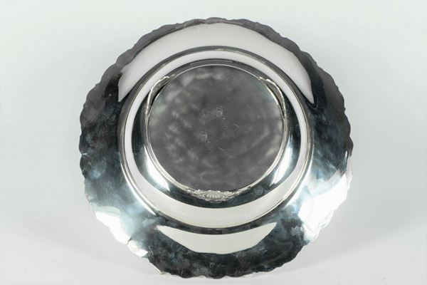 with embossed volute edge, supported by three shell feet. Weight gr. 360. Diameter cm. 27 x 7 h.