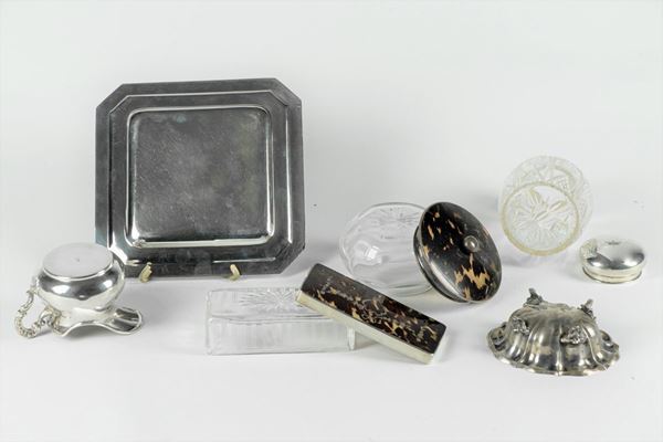 of a square saucer, a milk jug, an oval tub, a crystal bottle with silver rim and cap and two crystal boxes with tortoiseshell and silver lids, one round and one rectangular. Tot. 6 pcs. Weight gr. 410.