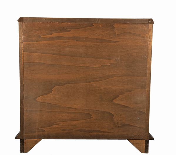 entirely inlaid with volutes and floral intertwining. The upper part with calatoia forming a desk, the lower part with three drawers and lion's legs. Measure cm. 113.5 x 56 x 116 h.