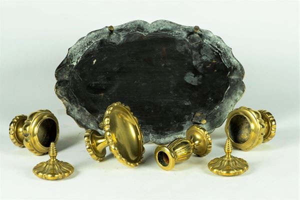composed of: two ink holders in the shape of amphorae missing the crystal trays, a candlestick, a backsplash and an oval tray. Tot. 5 pcs. Measure cm. 33 x 23 x 15 h.