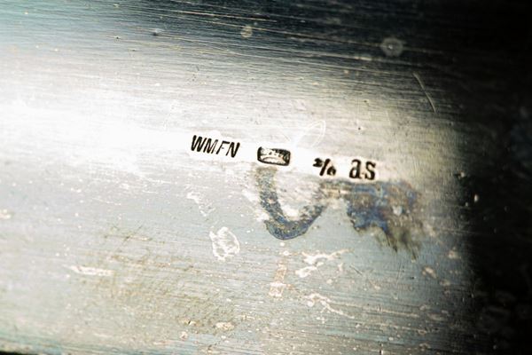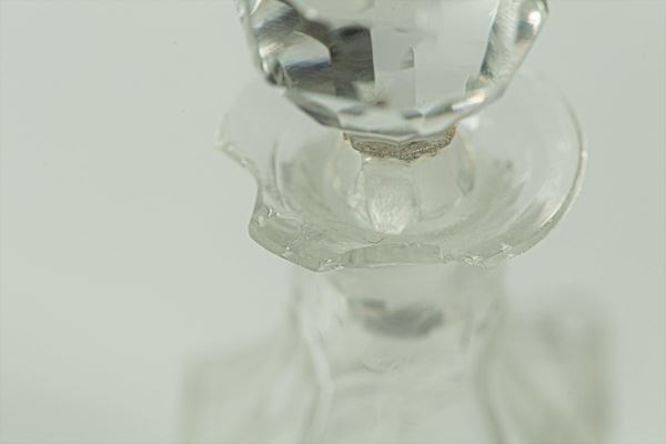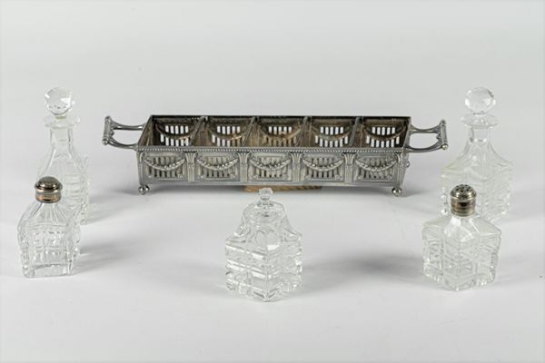 embossed and perforated with two crystal cruets for oil and vinegar, two salt and pepper and a mustard holder. Measure cm. 30 x 5 x 14 h.