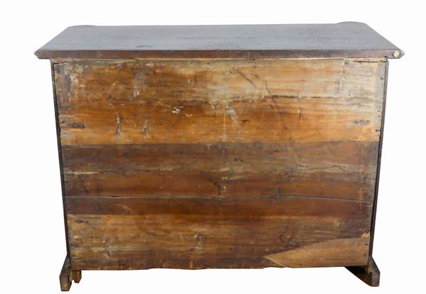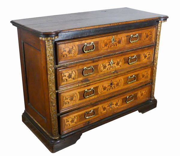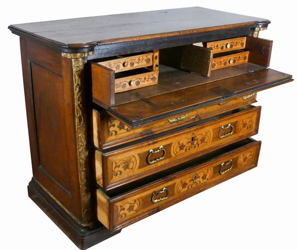 with floral scrollwork inlays and gilded and carved uprights, four pulls and slipper legs. cm. 147 x 68 x 110 h.