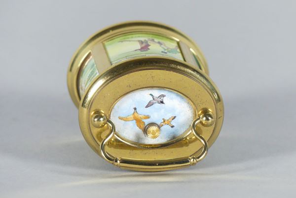 with polychrome enamel decorations with hunting scenes motifs, white enamel dial. Not working, to be overhauled. Height cm. 8.5.
