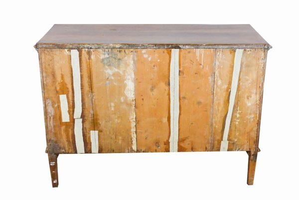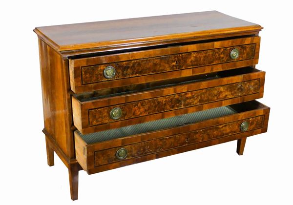 in walnut and walnut burl with geometric thread inlays, three drawers and four inverted truncated pyramid legs. cm. 140 x 56 x 99 h.