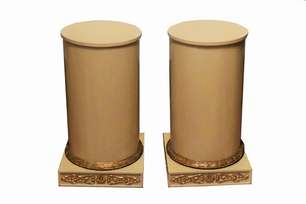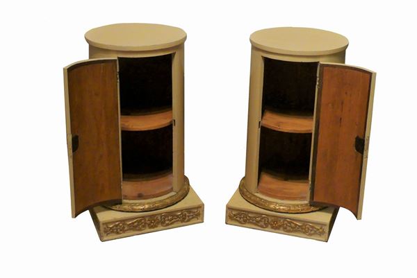 in the shape of neoclassical columns in ivory lacquered wood with friezes and carvings with Empire motifs, one door each. Bases: cm. 45 x 45 - Diameter of the top cm. 41 - Height cm. 81.