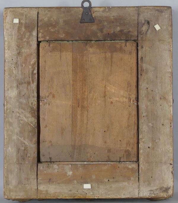 small oil painting on paper applied to the table, antique gilded and carved wooden frame. The painting has some lack of material and color. cm. 27 x 22.