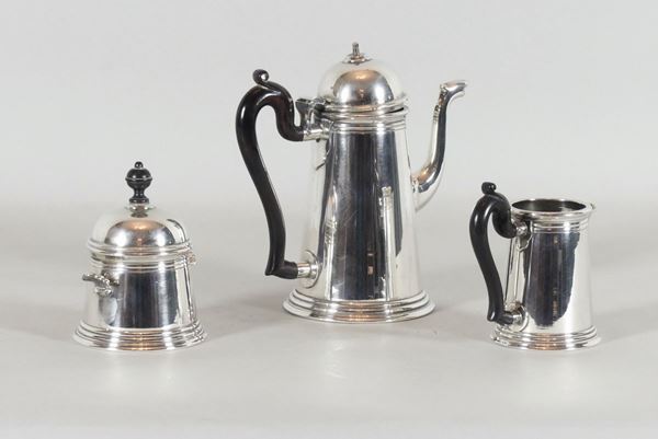 with handles and knobs in ebonized wood, consisting of: coffee pot, milk jug and sugar bowl. The lid of the coffee maker has a slight defect and the knob is missing. 3 pcs. Maximum height cm. 17.