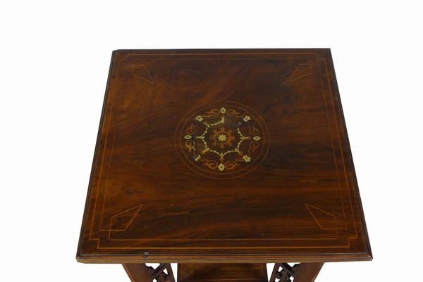 in briar walnut with inlays on the top in boxwood and ivory with scroll motifs, four curved legs joined by a small shelf below. cm & nbsp; 45 x 68 h.