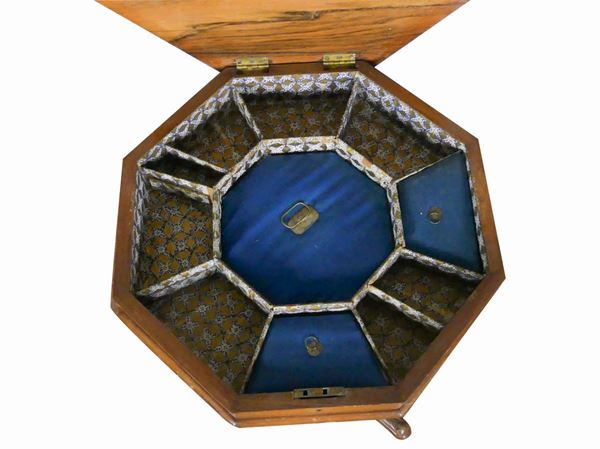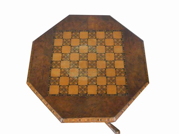 with chessboard inlaid on the top, inside compartments for sewing, supported by a faceted cone base resting on three curved legs. cm. 43 x 43 x 69 h.