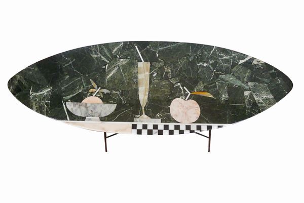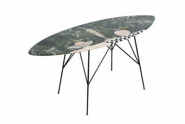oval-shaped with green marble top and wrought iron base. cm. 110 x 39 x 50 h.